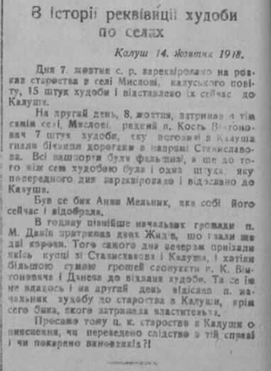 “Калуш 14 жовтня 1918 . Дня 7 жовтня с.р. зареквізовано на розказ староства в селі Мислові, калуського повіту, 15 штук худоби і відставлено їх сейчас до Калуша.