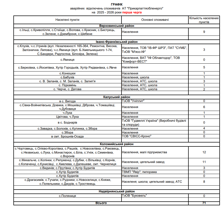 Графіки аварійних вимкнень розподілені між 10-ма чергами побутових і промислових споживачів, які не під’єднані до об’єктів критичної інфраструктури. Застосовувати можуть, як одну чергу, так і декілька або навіть усі одразу.