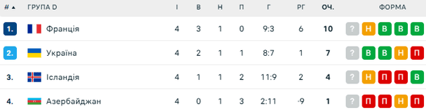 Після чотирьох турів турів збірна України посідає друге місце у своїй групі відбору на ЧС-2026 із 7 заліковими пунками у активі. Наразі лідером є збірна Франції із 10 балами. Третє місце займає Ісландія (4 пункти), а замикає квартет Азербайджан (1 очко).