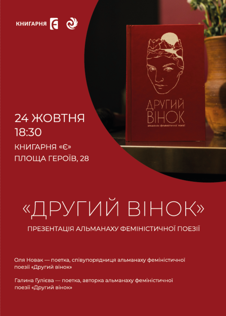 Книгарня «Є» спільно з Благодійною організацією «Крила підтримки» запрошує на презентацію альманаху «Другий вінок» та розмову про феміністичну поезію.