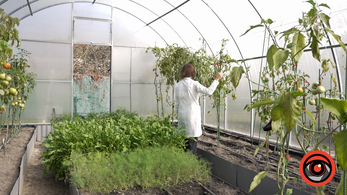 Олександр Перегінець у теплиці, де науковці вирощують овочі