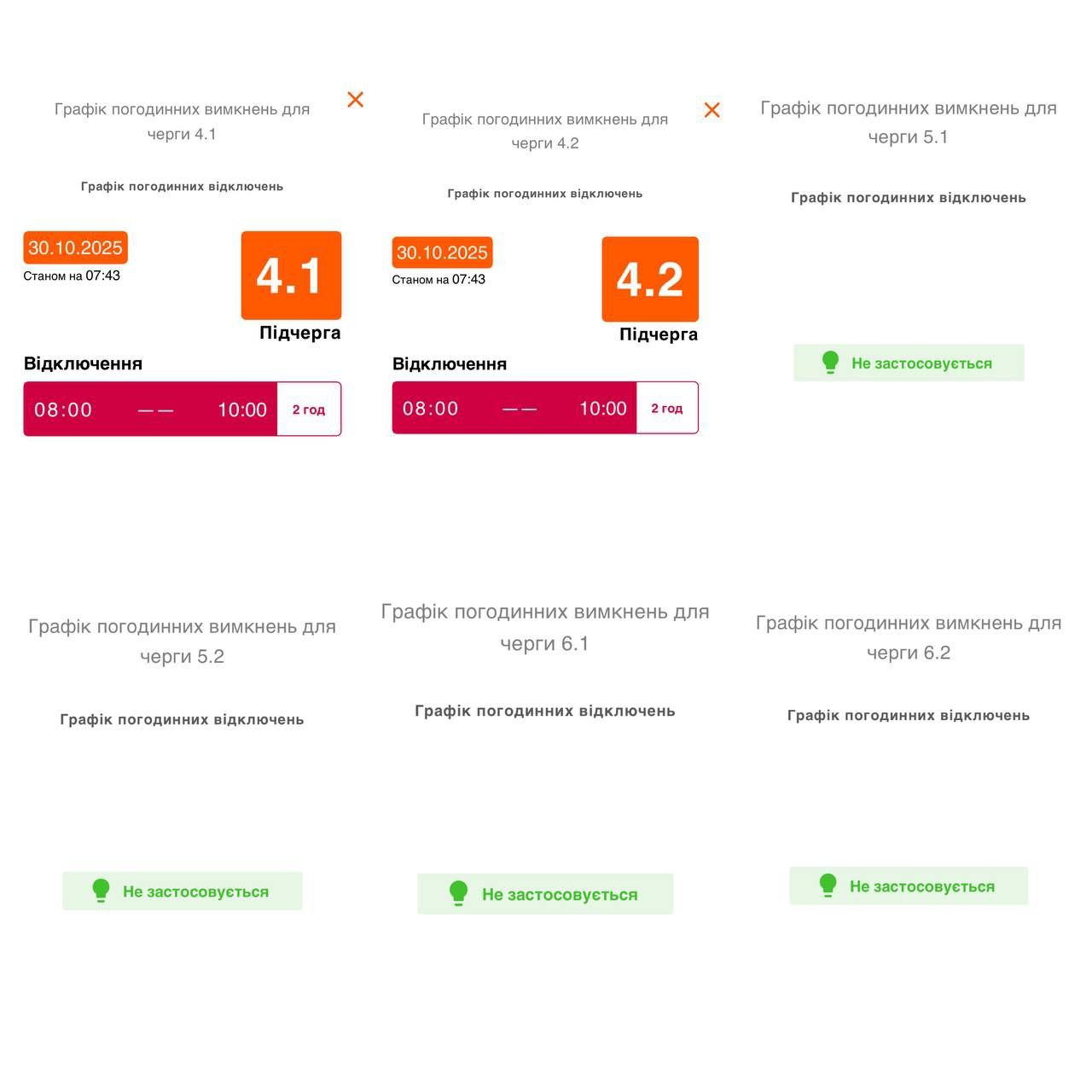 Також буде застосовуватися одна черга графіків погодинних вимкнень (ГПВ) для побутових споживачів з 8:00 до 10:00 та з 14:00 до 19:00.
