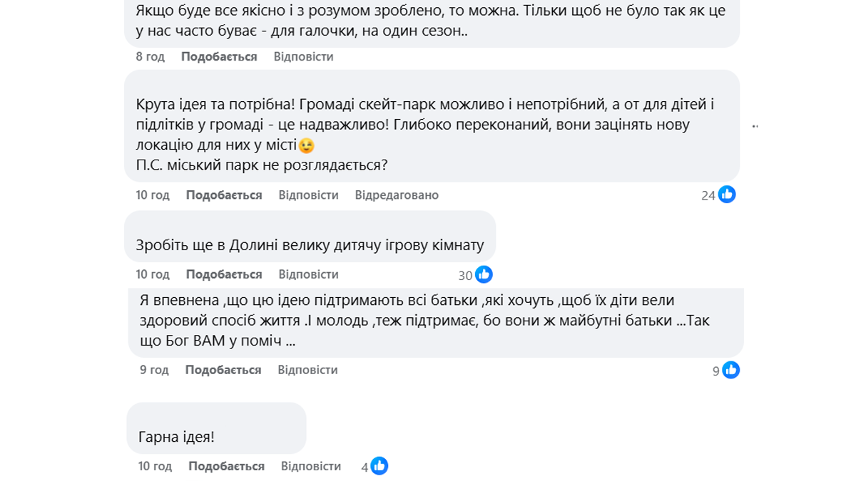Одна із долинянок звернула увагу, що у випадку будівництва такого простору у місті, його слід робити із гумовим покриттям, аби зменшити небезпеку травмування підлітків: