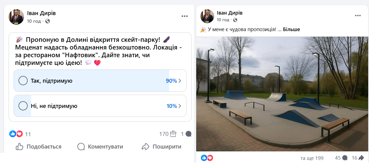 Спочатку допис, а згодом і онлайн-опитування міський голова Долини Іван Дирів розмістив на своїй Facebook-сторінці із запитанням: “Пропоную у Долині відкриття скейтпарку. Меценат надасть обладнання безкоштовно. Локація – за рестораном “Нафтовик”. Дайте знати чи підтримуєте таку ідею”