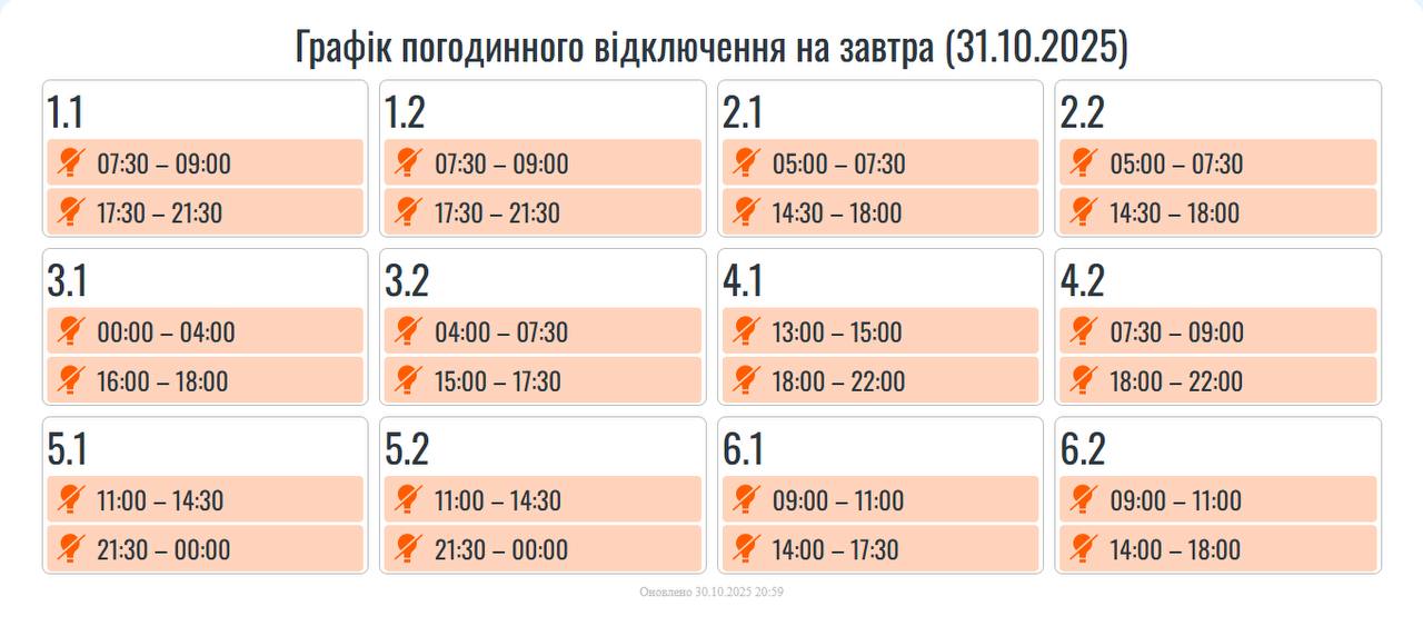 ОНОВЛЕНО (8:00): Черга 1.1 та 1.2 вимикатиметься протягом 7:30-11:00.