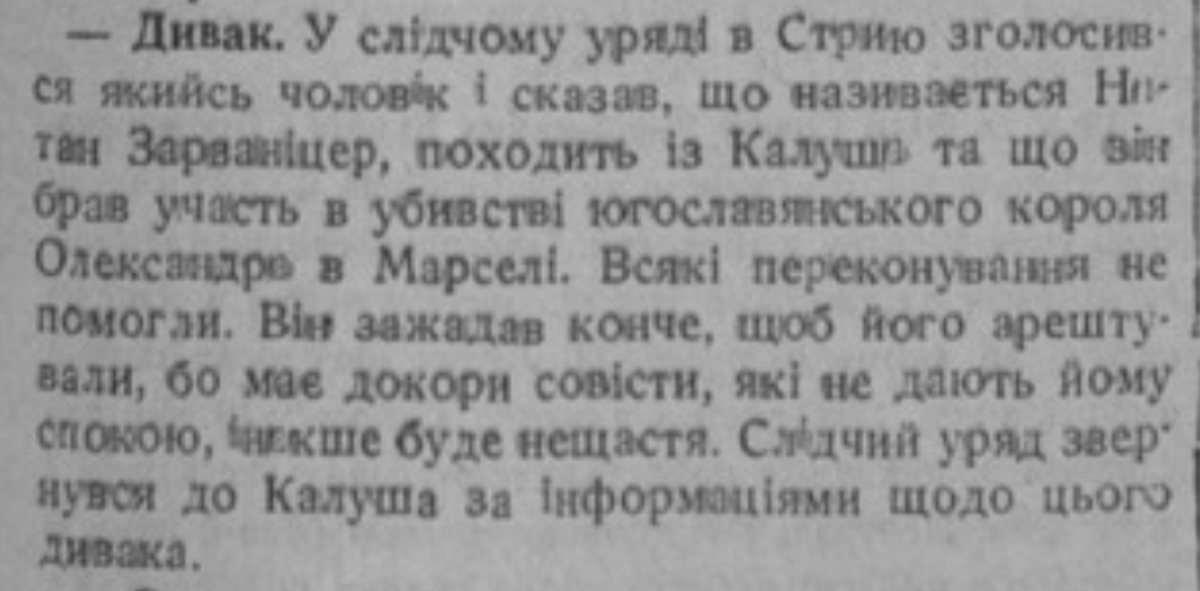 “У слідчому уряді в Стрию зголосився якийсь чоловік і сказав, що називається Натан Зарваніцер, походить із Калуша та що він брав участь в убивстві югославянського короля Олександра в Марселі. Всякі переконування не помогли. Він зажадав конче, щоб його арештували, бо має докори совісти, які не дають йому спокою, інакше буде нещастя. Слідчий уряд звернувся до Калуша за інформаціями щодо цього дивака”, — йдеться у газетному повідомленні