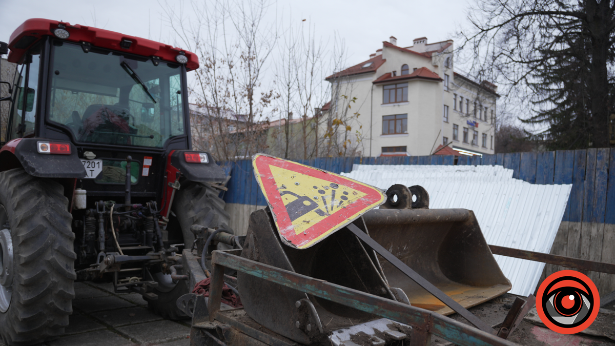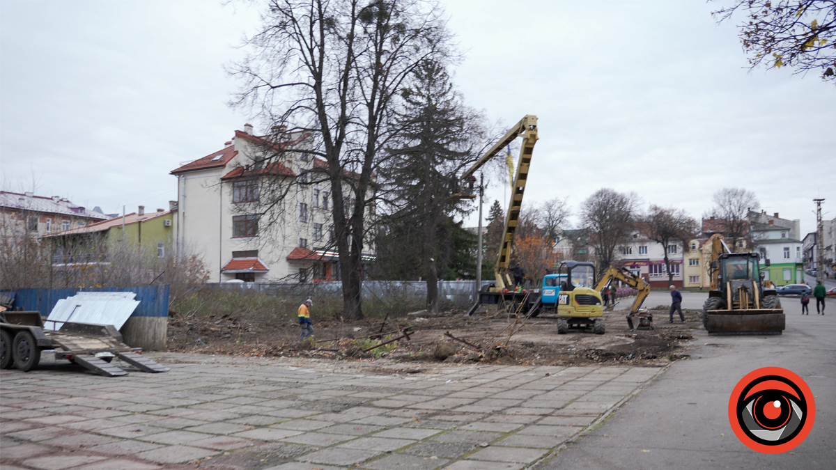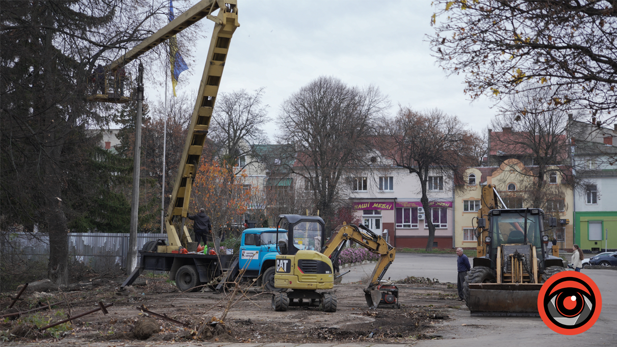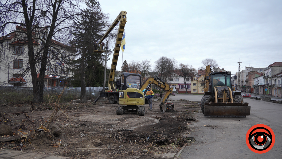 Трактори, автовишка та люди із бензопилами пораються у середмісті Калуша. Як розповіли очевидці, роботи на площі Героїв киплять від самісінького ранку. Зараз тут аж посвітлішало: кущі та дерева більше не заступають будівлю, а паркан — не закриває добру частину середмістя.