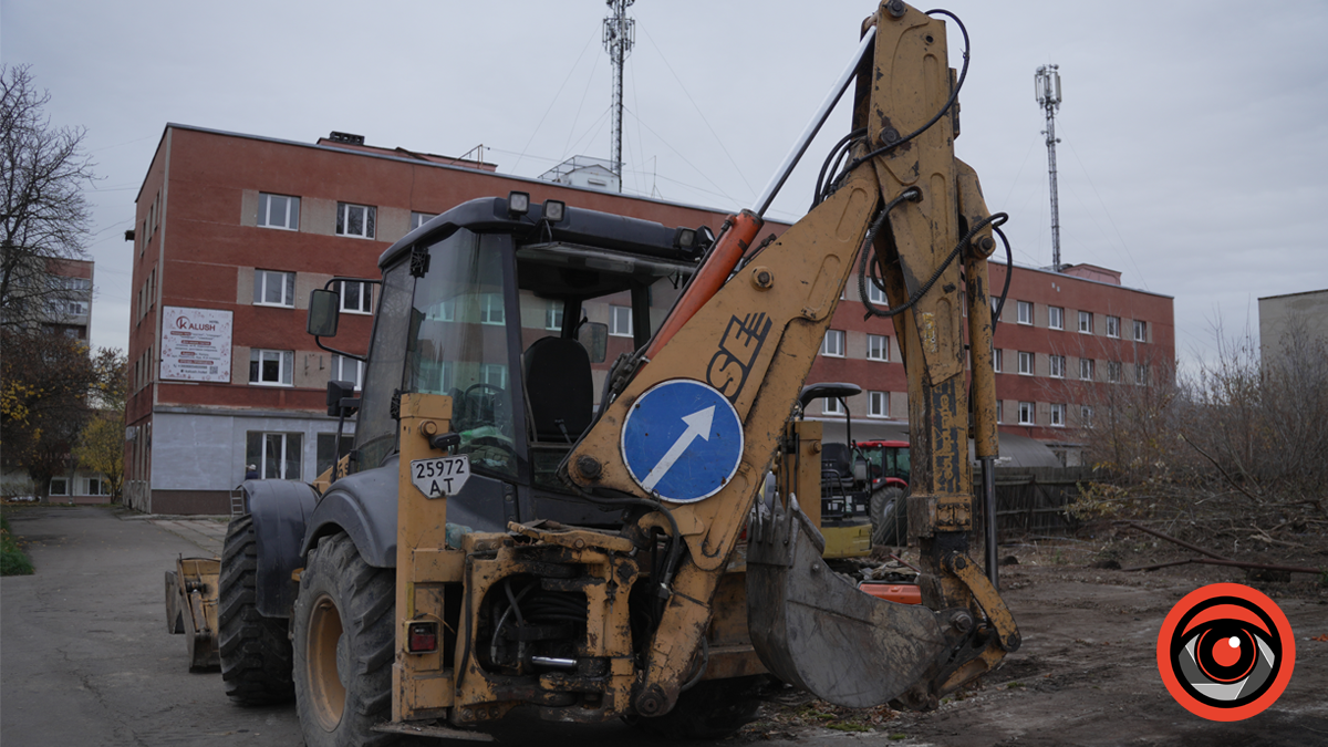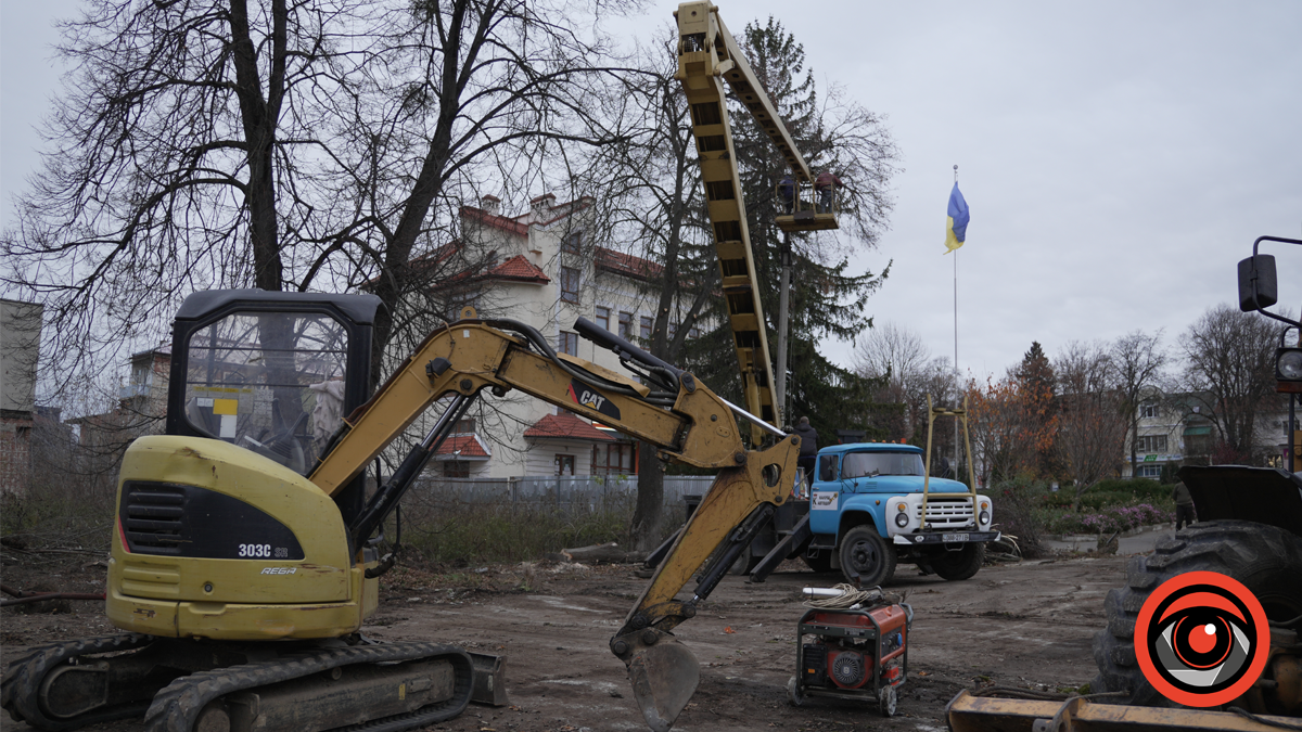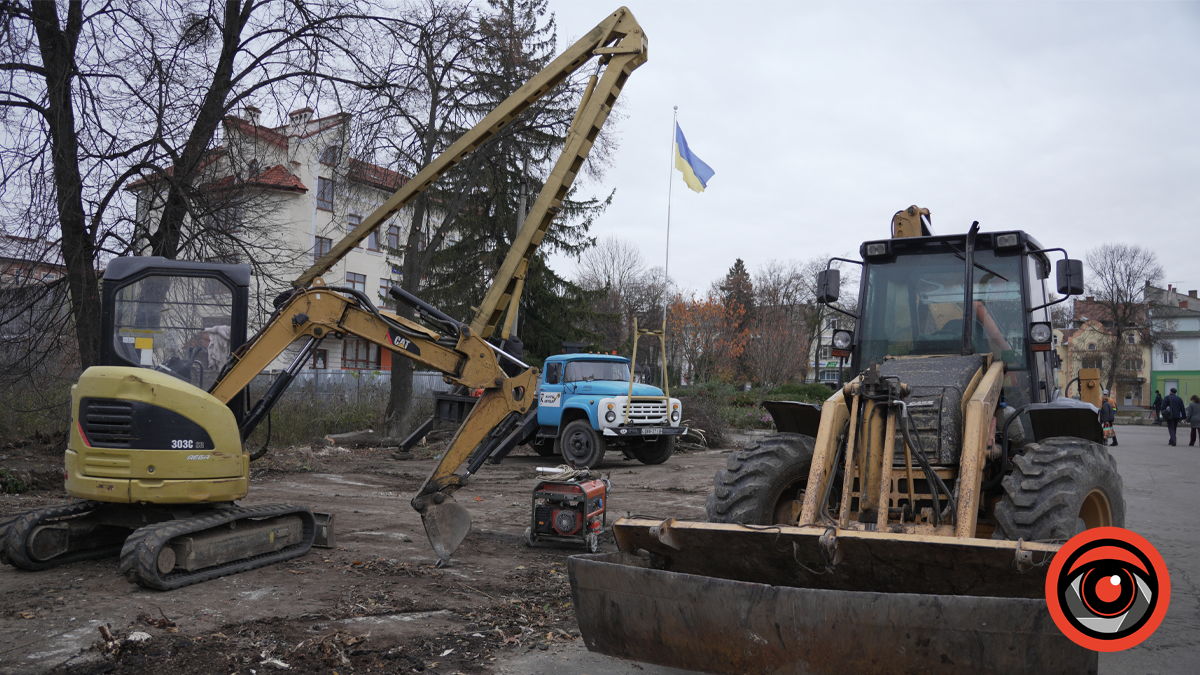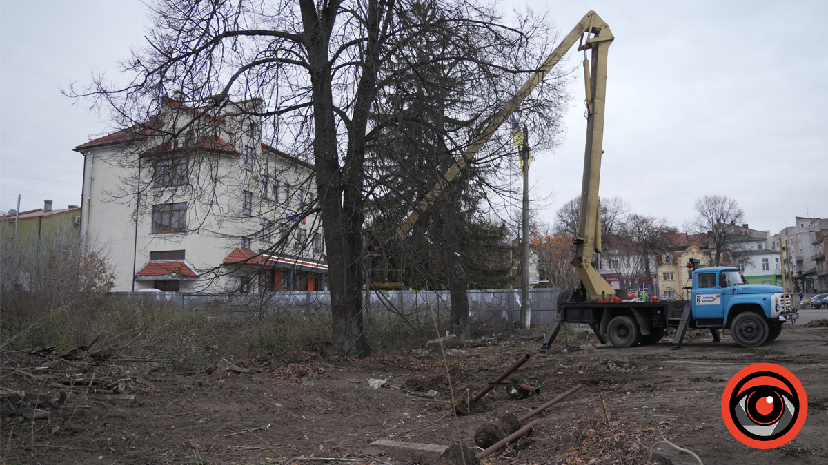 Трактори, автовишка та люди із бензопилами пораються у середмісті Калуша. Як розповіли очевидці, роботи на площі Героїв киплять від самісінького ранку. Зараз тут аж посвітлішало: кущі та дерева більше не заступають будівлю, а паркан — не закриває добру частину середмістя.