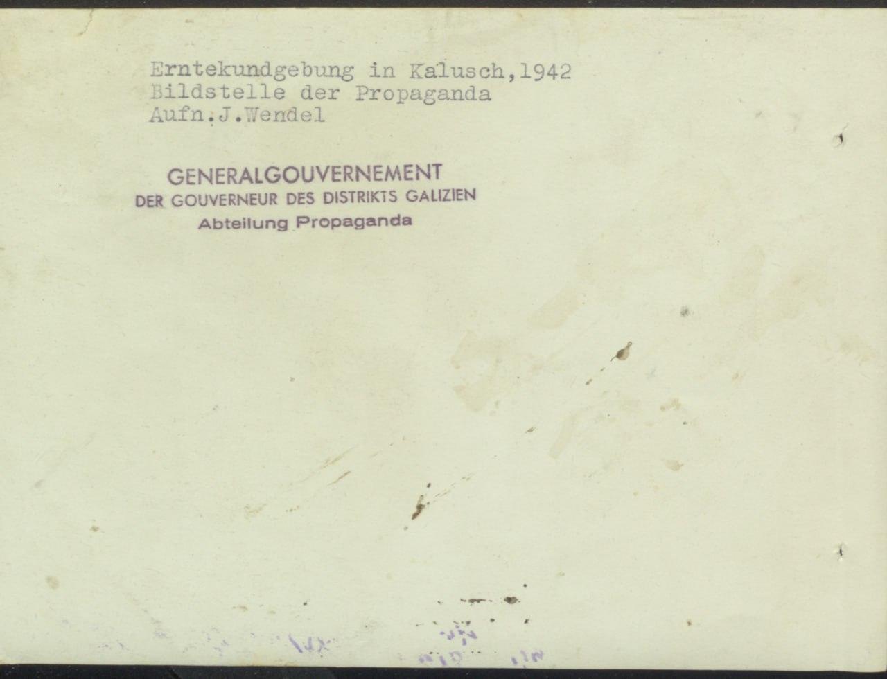 На звороті фото вказано, що це свято врожаю у Калуші 1942 року. Автором світлини є Й. Вендель, який, ймовірно, працював у відділі пропаганди дистрикту Галичина, що відносився до Генерального Губернаторства.