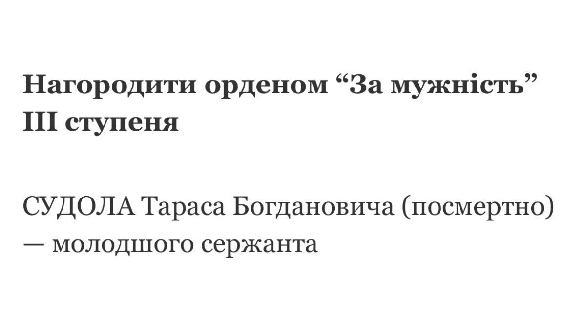 нагородити орденом “За мужність” III ступеня Судола Тараса Богдановича (посмертно) – молодшого сержанта”, – йдеться в тексті указу президента