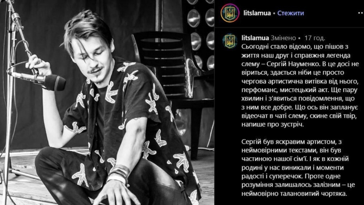 “Стало відомо, що пішов з життя наш друг і справжня легенда слему – Сергій Науменко. В це досі не віриться, здається ніби це просто чергова артистична витівка від нього, перформанс, мистецький акт. Ще пару хвилин і з’явиться повідомлення, що з ним все добре. Що ось він запланує відеочат в чаті слему, скине свій твір, напише про зустріч… Сергій був яскравим артистом, з неймовірними текстами, він був частиною нашої сім‘ї. Він назавжди залишиться в нашій пам’яті”.