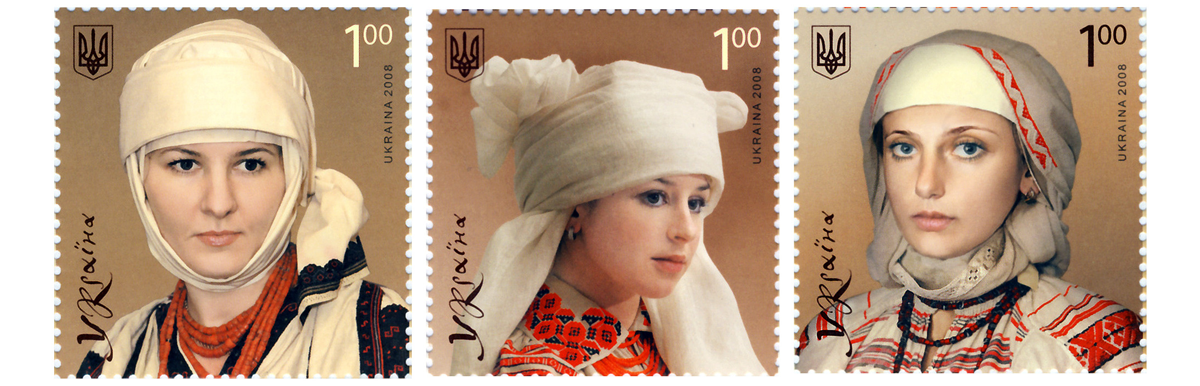 Зліва – убір подружжя Святослава на мініатюрі до Ізборника Святослава 1073 р. Справа – убрус та хутряна шапка. Київська Русь, XI—XIV ст. (марка “Укрпошти”, 2006 рік)