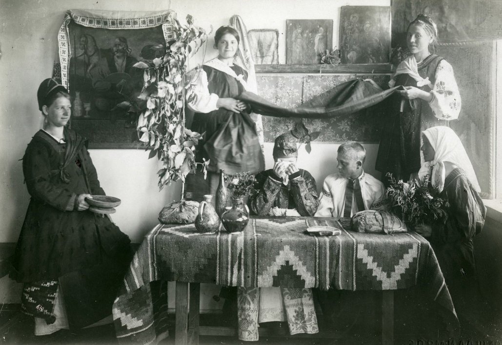 Покривання молодої, яка оплакує своє дівування після вінчання. Свашка (зліва) тримає тарілку, на якій подавали очіпок – знак заміжньої жінки. Наречена на фото вже одягла його. 1909 рік, неподалік м. Дніпро. Джерело: Локальна історія