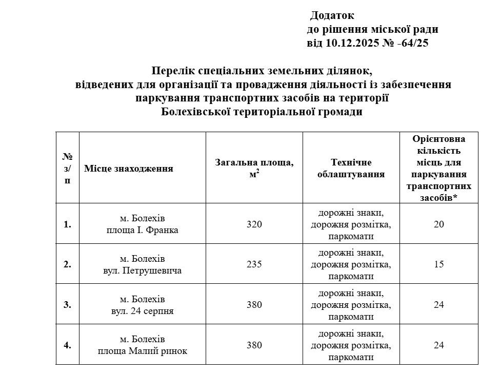 У Болехові визначили земельні ділянки, площу та орієнтовну кількість місць для платного паркування транспортних засобів.