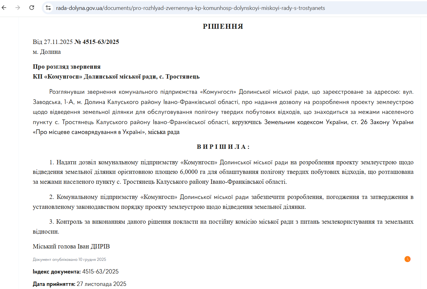 Близько двох тижнів тому депутати схвалили рішення, яким надали дозвіл комунальному підприємству “Комунгосп” на розроблення проєкту землеустрою щодо відведення земельної ділянки орієнтовною площею 6 га для облаштування полігону твердих побутових відходів.
