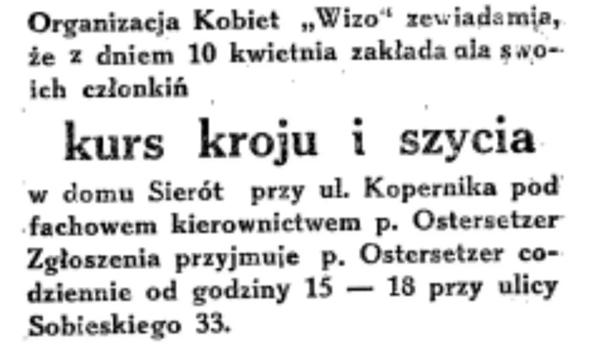 “Організація жінок „Wizo“ повідомляє, що з 10 квітня відкриває для своїх членкинь курс крою і шиття, який проходитиме в “Домі сиріт” на вул. Коперника під фаховим керівництвом пан Остерзетцер. Пан Остерзетцер приймає заявки щоденно з 15 до 18 години за адресою: вул. Собєського 33″