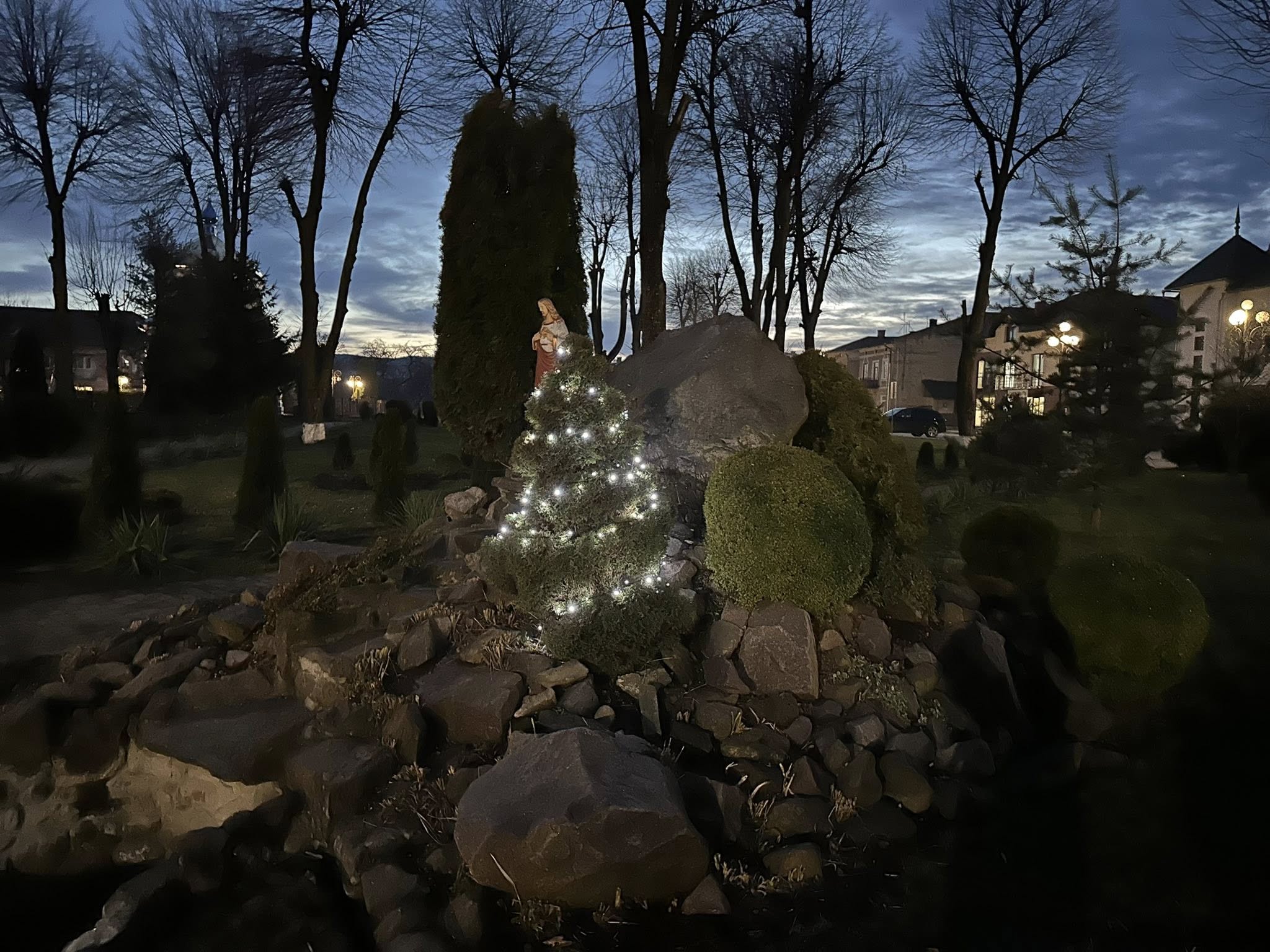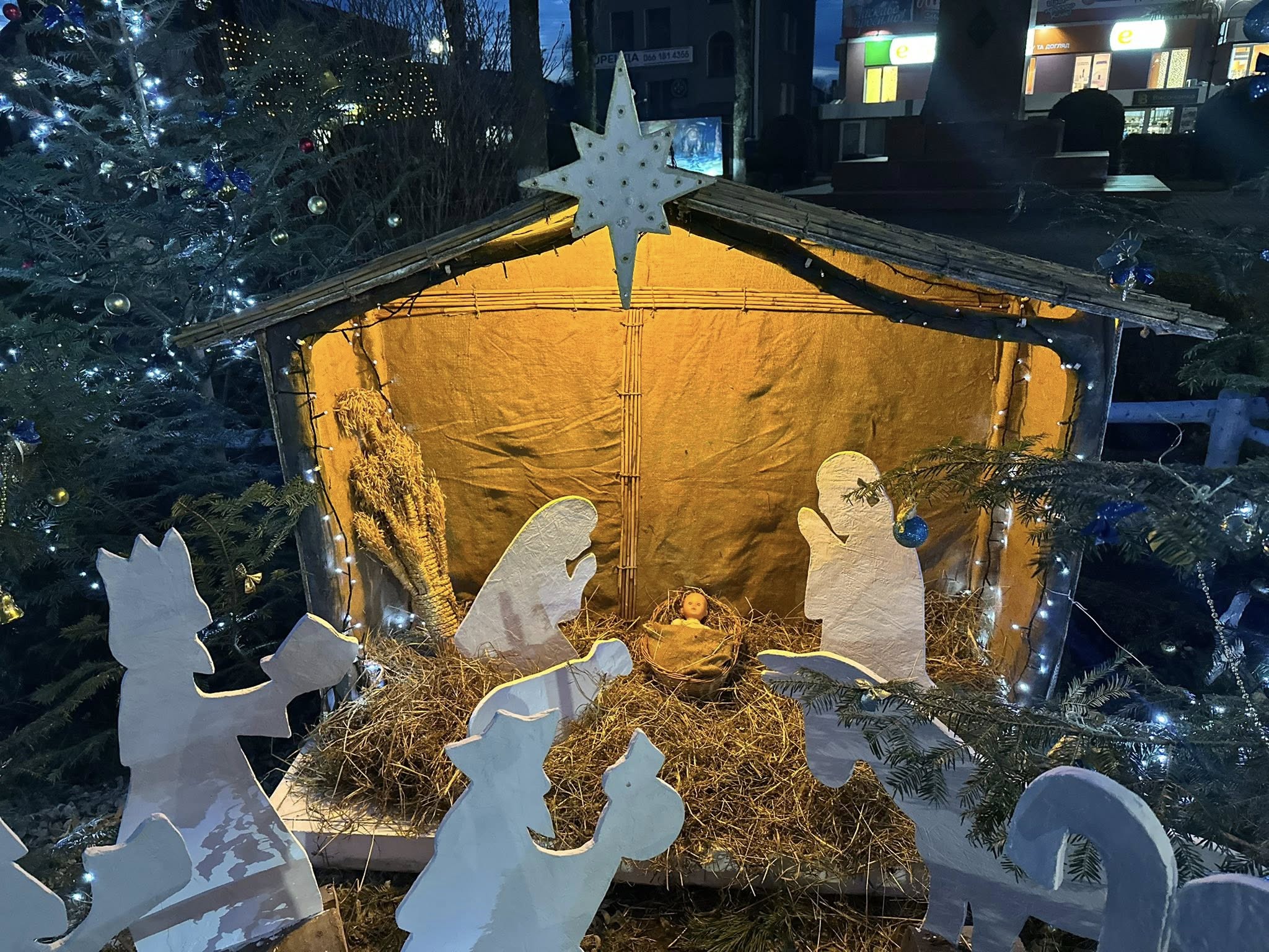 Центр Болехова засяяв різдвяними вогнями. Святково вбрані ялинки та вертеп створюють відчуття свята.