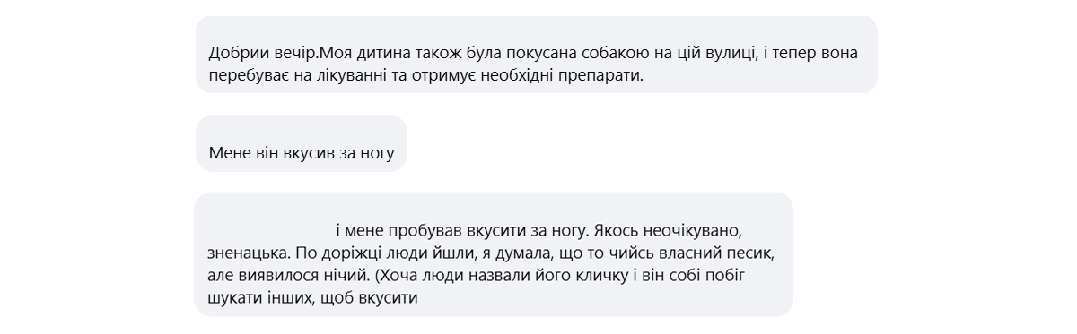 “Близько 18:30 поверталася додому. Собака йшла просто навпроти мене і досить спокійно… Вона майже мене минула, але повернулася і просто вкусила за ногу — аж до крові, прокусивши джинси”.