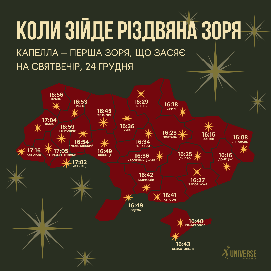 Цьогоріч перша зірка, яку часто називають різдвяною, має назву “Капелла”. 24 грудня 2025 року на Прикарпатті захід Сонця слід очікувати близько 16:28, а різдвяна зоря зійде орієнтовно о 17:05.
