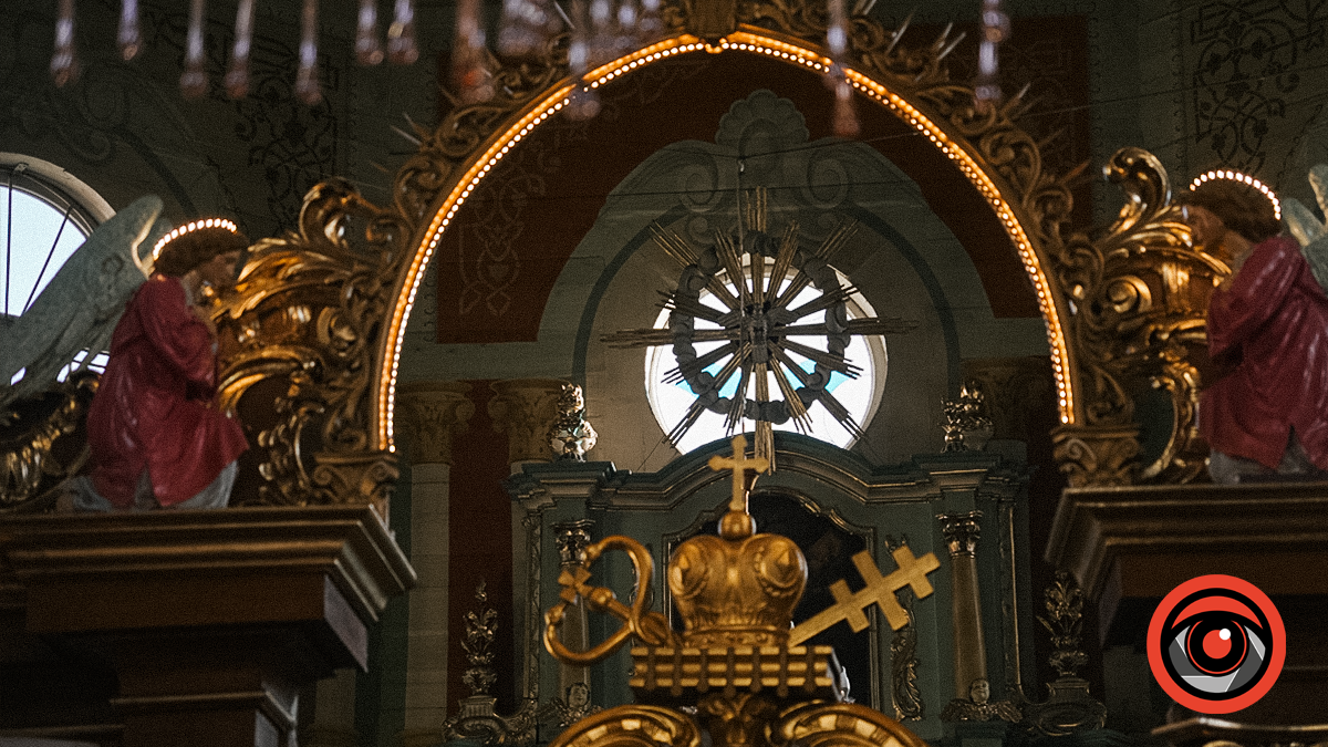 І є історія, на жаль ми не змогли знайти її правдивого підтвердження, що саме цей іконостас, хоча є ще навіть свідки, які знають, в 30-х роках його було перевезено зі Львова, із собору Юри, було перевезено на дев’яти фірах, ще навіть хтось сказав, що воли їх тягнули, а не так, як ми звикли зараз, що коні. І це десь наштовхує ще на ту думку, тому що ми бачимо хрест не звичний, а, власне, хрест на царських воротах поруч з мітрою, хрест Митрополита Андрея Шептицького, саме такий його студицький хрест, знаєте. І це, ну, десь наштовхує ще до більшого дослідження.