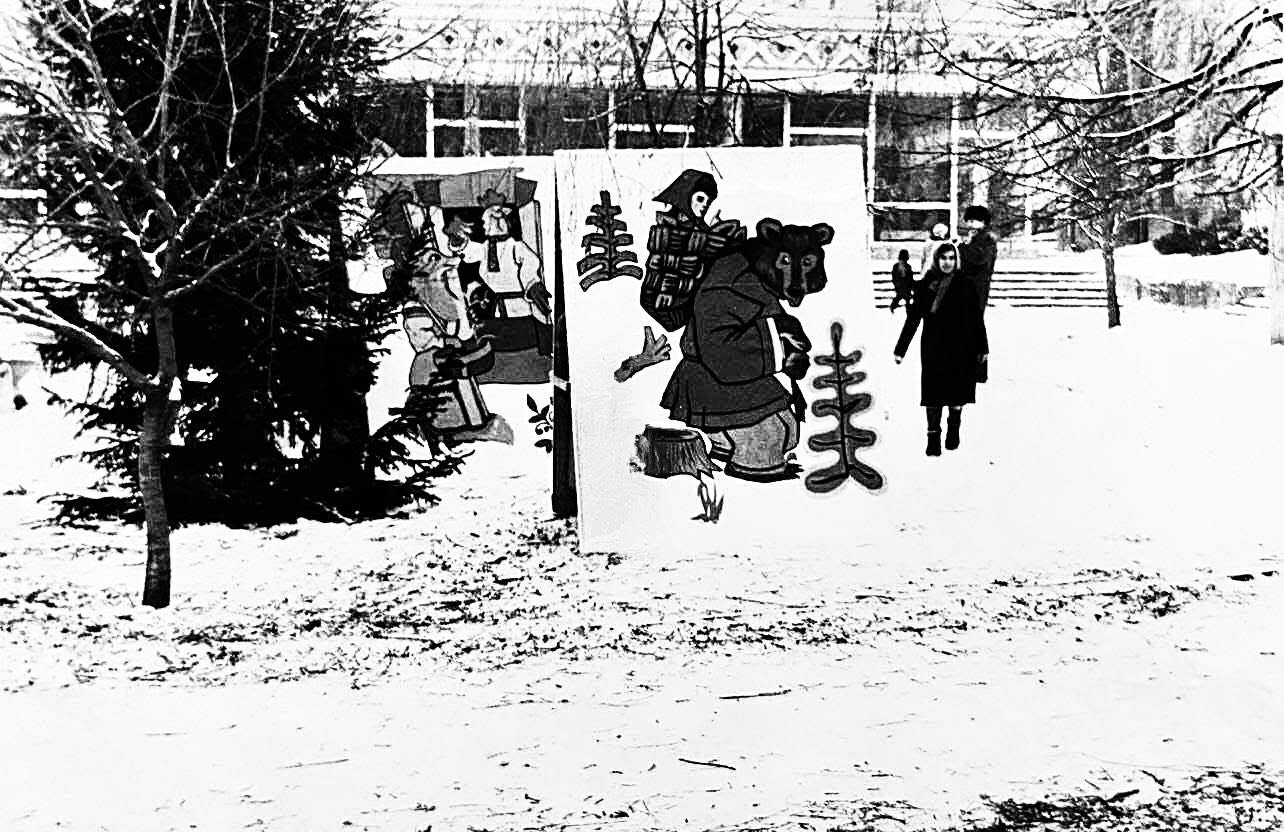 На передньому плані дерево, яке схоже на міську ялинку. Це свідчить, що у 80-их головна ялинка Калуша була не на звичному для нас тепер місці , а значно далі – навпроти готелю “Асторія” (тепер – “Kалуш”). Святковими декораціями слугують зображення ведмедя , який несе на плечах дівчинку, а також інші казкові мотиви.