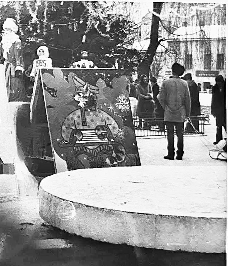 На новорічних світлинах з Калуша 1985 року зафіксувано площу біля кінотеатру “Відродження” (тоді — імені ленінського комсомолу). Фото зроблені під час першосічневої прогулянки та дозволяють побачити дещо інше планування центрального простору міста.