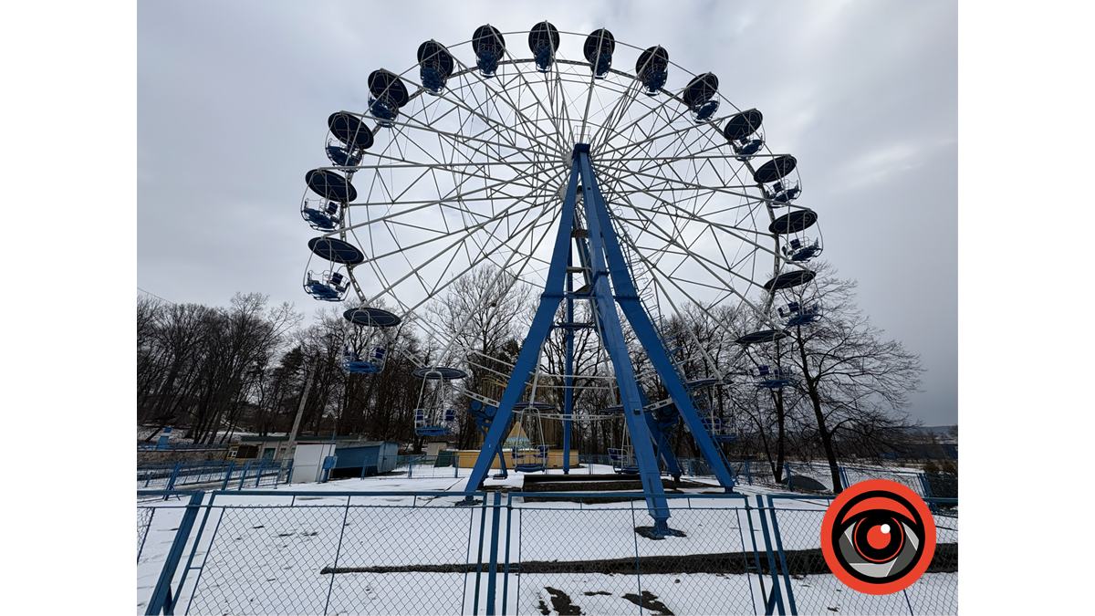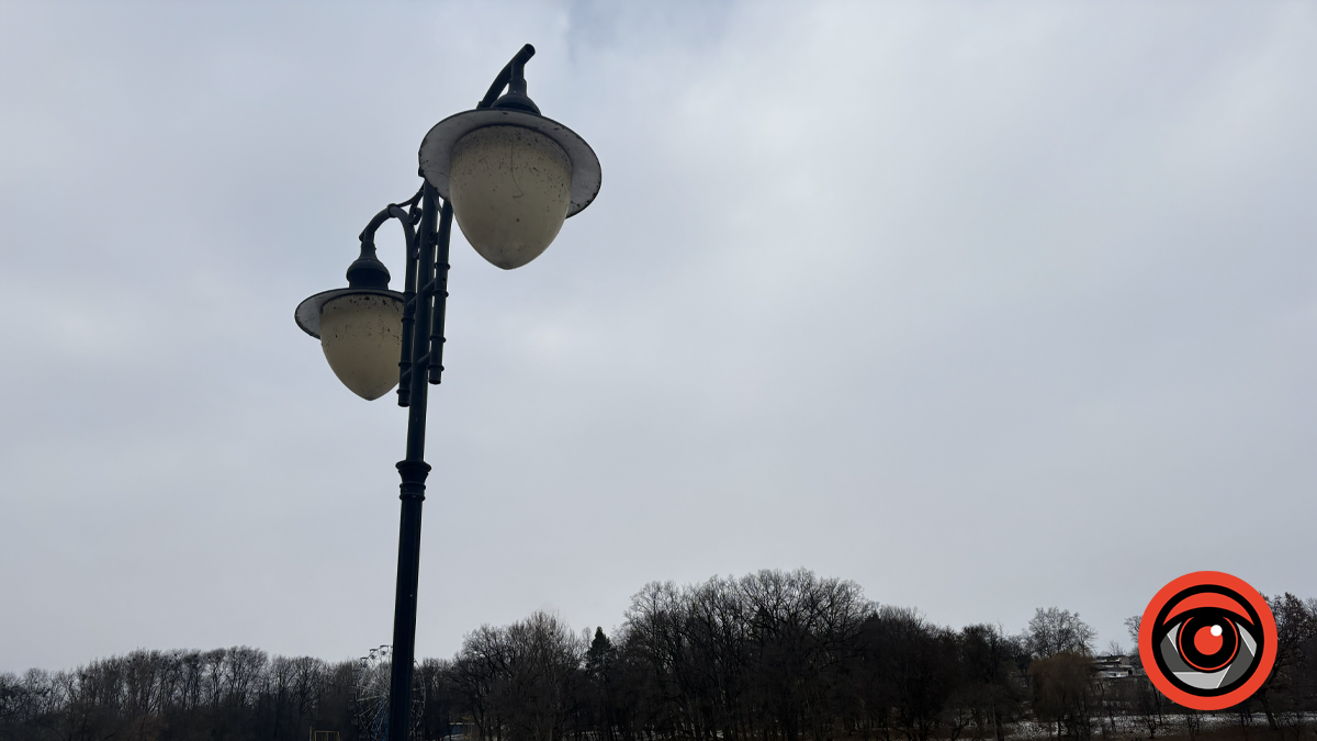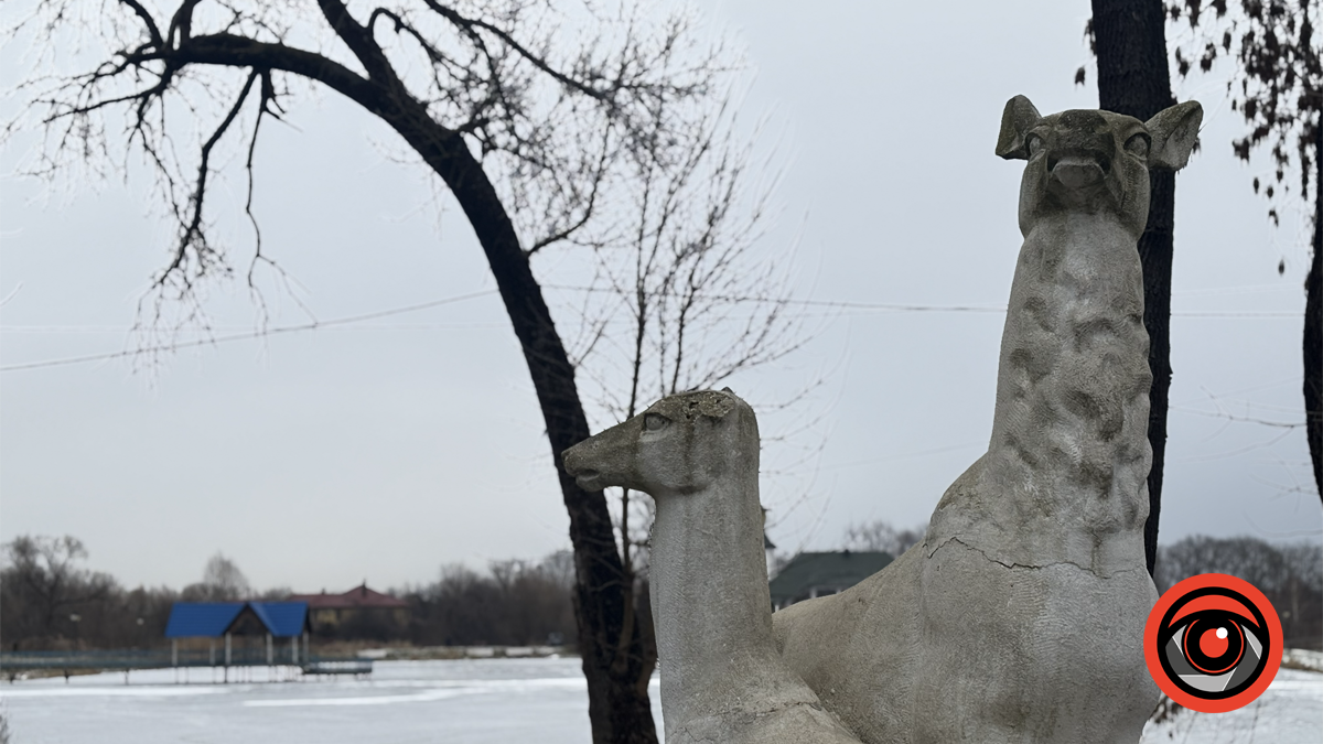 Люди, які гуляють парком обов’язково проходять повз мовчазних охоронців – оленів, що тут вже давно знайшли своє “законне” місце. Сніг у парку лежить нерівно — десь витоптаний, десь чистий і світлий. На гілках дерев він тримається обережно, не перевантажуючи простір. Узимку парк ніби стає відкритішим: без листя краще видно простір, воду, та поодинокі далекі силуети людей. Усе зайве зникає, залишаються форма й ритм.