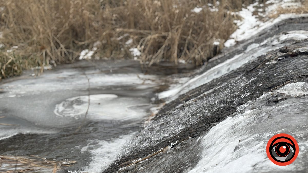 На тлі застиглої води особливо вирізняються місця, де вона ще тече. Там, де струмки не встигли взятися льодом, зберігається слабкий рух — темна вода повільно стікає, обрамлена крижаними краями. Саме ці деталі додають пейзажу глибини й нагадують: навіть узимку парк не завмирає остаточно, а лише сповільнюється.