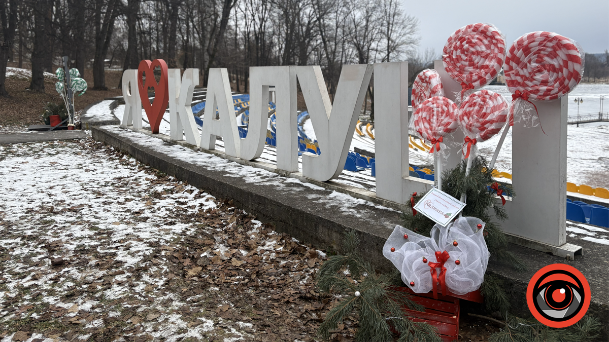 Калуський парк узимку стихає. Озеро скувала крига. Мороз утримує простір у напрузі: повітря різке, а кроки вздовж озера звучать чіткіше. Людей небагато — хтось швидко проходить повз, хтось на мить зупиняється, вдивляючись у зимовий пейзаж.