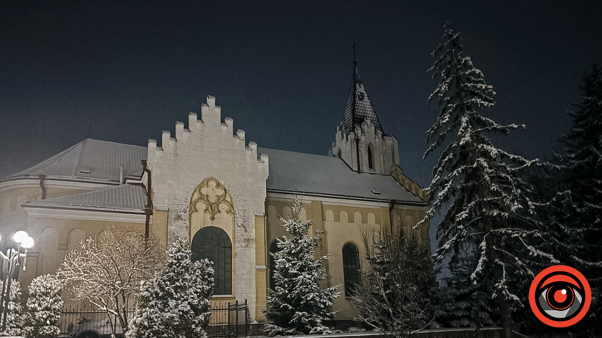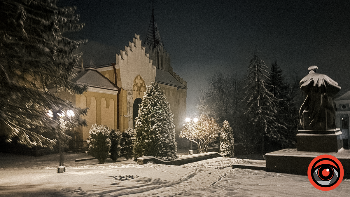 Центр Калуша того вечора виглядав особливо зібраним і спокійним. Засніжені площі та тротуари відбивали світло ліхтарів, створюючи м’яку, рівну підсвітку без різких контрастів. Тут відчувалась тиша, притаманна саме зимовим вечорам, коли місто ніби зупиняється на кілька хвилин.