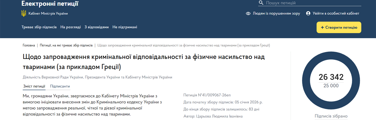 Українці зібрали необхідну кількість підписів під петицією щодо запровадження кримінальної відповідальності за фізичне насильство над тваринами. У приклад подають досвід Греції.