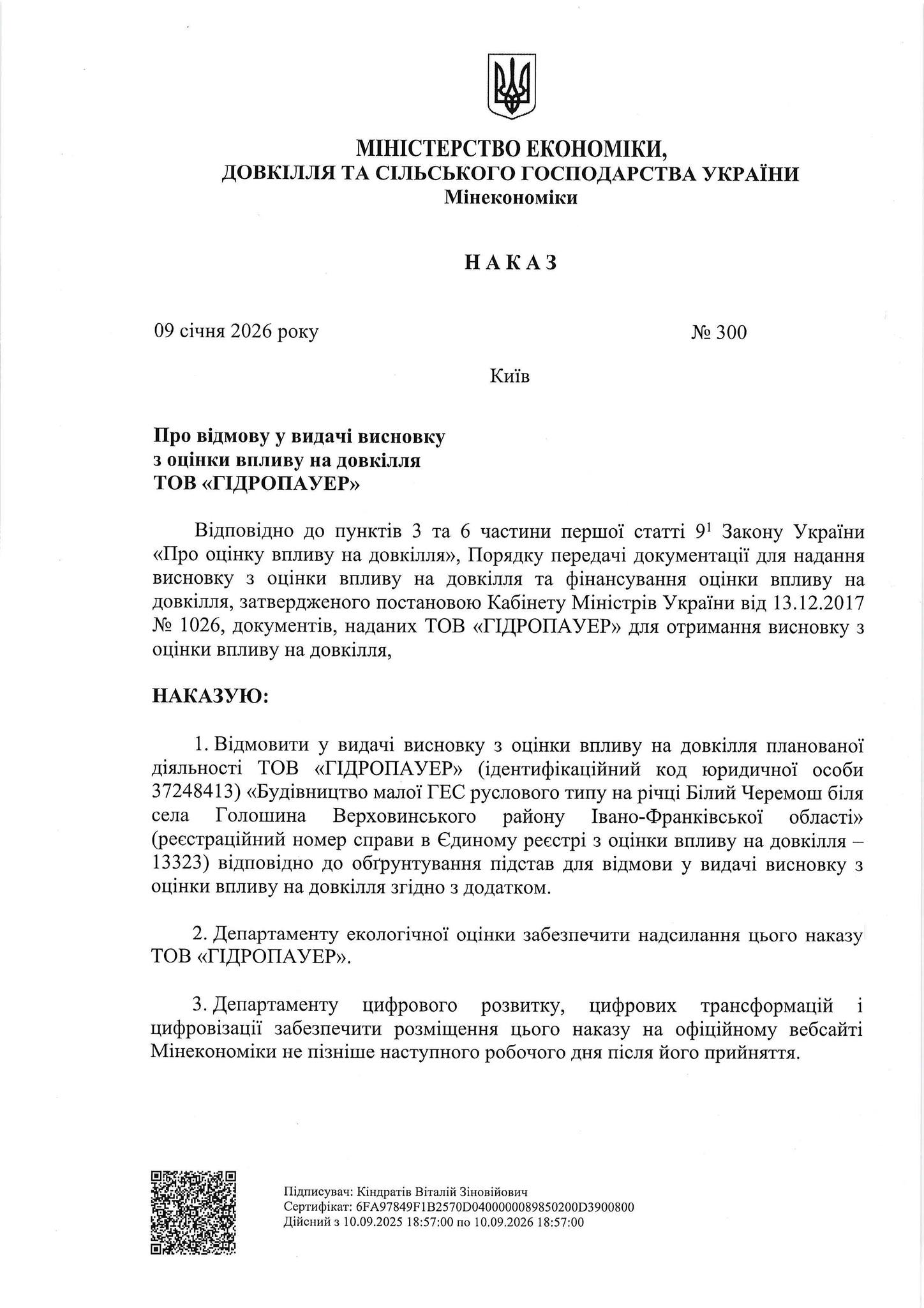 Активіст оприлюднив наказ Міністерства з повним обґрунтуванням та подякував за збереження річки чиновникам Міністерства, Чернівецькому рибоохоронному патрулю, який чітко висловили свою позицію щодо негативного впливу ГЕС на збереження водних біоресурсів, а також місцевим мешканцям, які в свій час блокували дорогу і не допустили це будівництво.