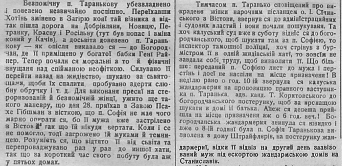 В неділю рано о год. 10 ій звернула ся калуська жандармерия на пропозицію правного заступника п. Таранька, адв. канд. Т, Коритовського до богородчанського постерунку, щоб за пропащою шукати в домі її батька. Алеж ся депеша прийшла на місце призначеня аж о 6 год. веч.! Богородчанська жандармерия звинула ся швидко і вже о 8-ій годині була п. Софія Таранькова визволена з дому Штрайфлерів, на постерунку жандармериї, відки її відвіз на другий день зазвізований муж під ескортою жандармською домів на Станиславів.