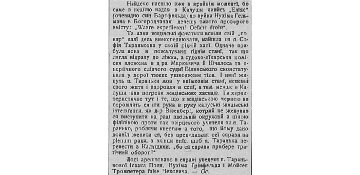Та заки жидівські фаватики веліли свій “товар” далі десь виекспедиювати, найшла ся п. Софія Таранькова у своїй рідній хаті. Одначе прибула вона в пожалуваня ріднім стані, так що лягла відразу до ліжка, а судово-лїкарська комісия зложена з д-ра Маркевича й Кічалеса та енерґічного слідчого судиї Білинського сконстатувала у хорої тяжке ушкоджене тіла. І нині живуть п. Тараньки мов у виїмковім станї, непевні свого житя і здоровля в селі, а тим менше в Калуши ізза погрози жидівських хасидів.