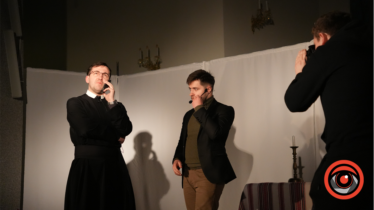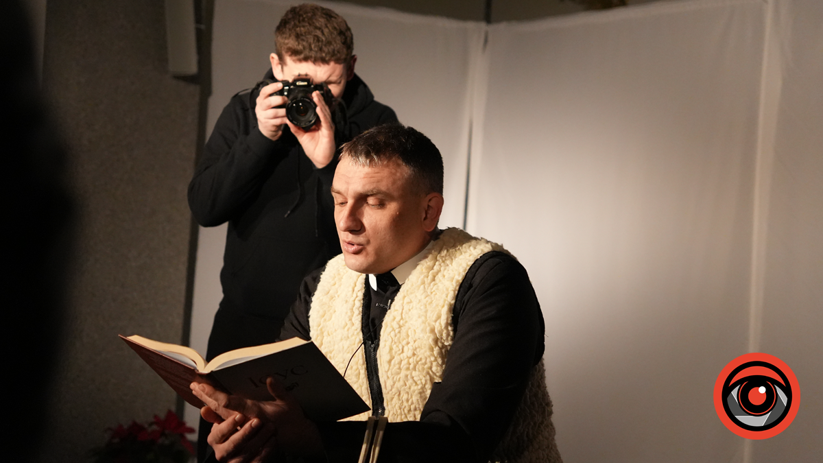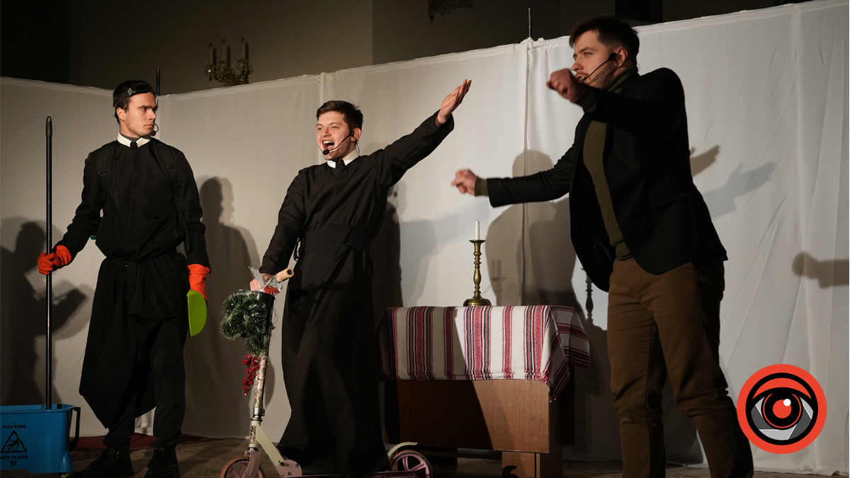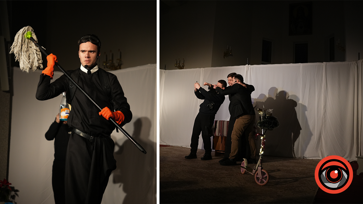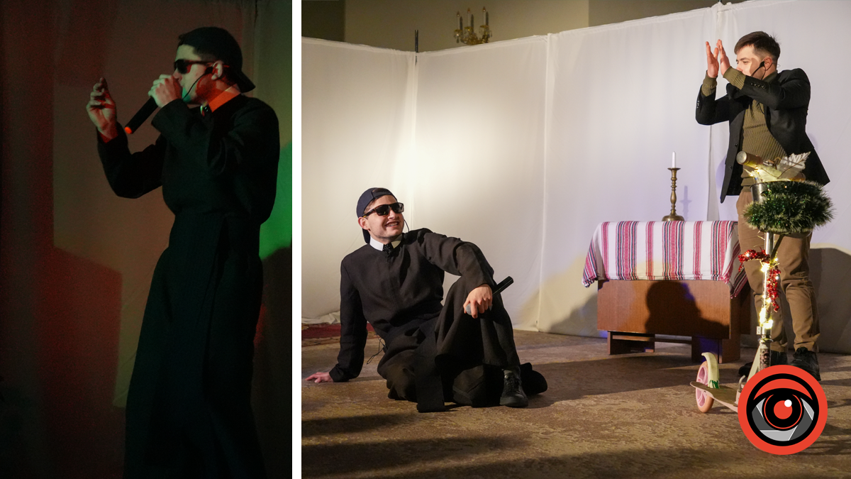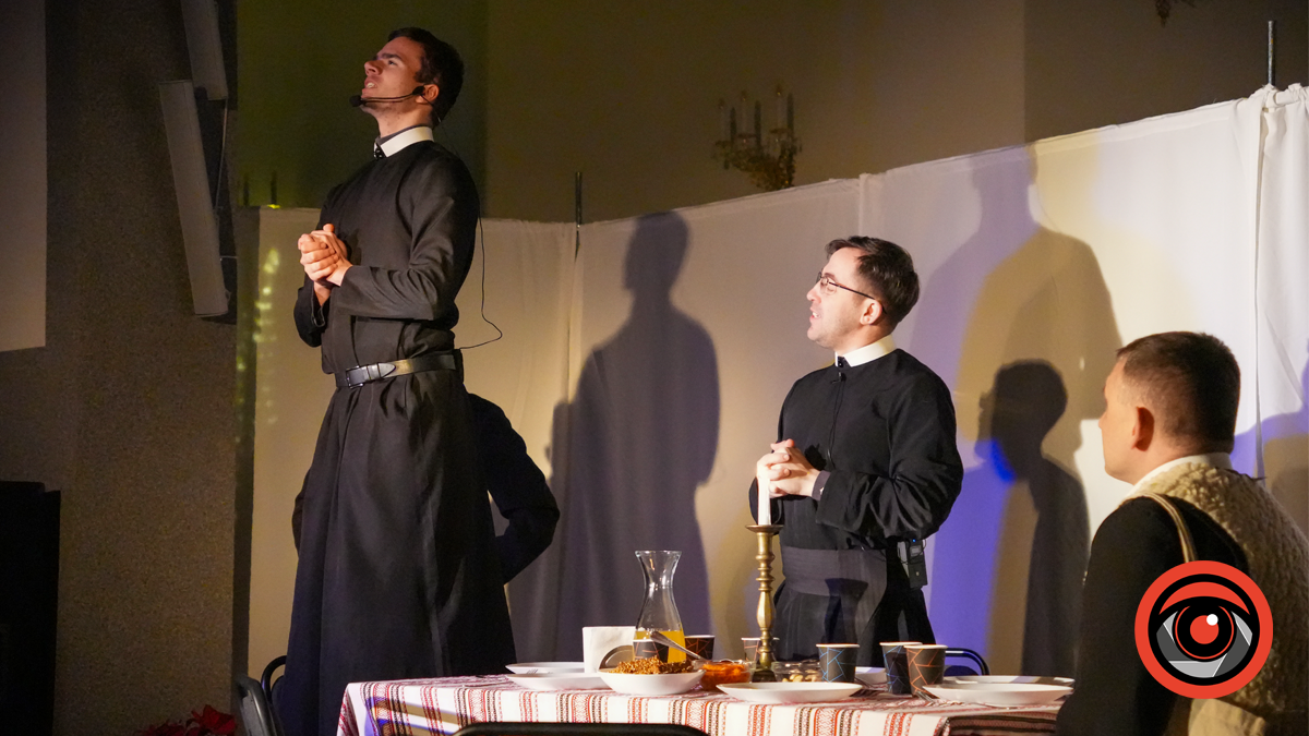 По-друге, вистава говорить про формальну віру. Молитви, Святе Письмо, різдвяний стіл — усе ніби правильно, але без живого співпереживання та відповідальності ця віра стає обрядовістю. Саме тому журналісти не бачать Ісуса на записі: для стороннього ока, яке шукає лише картинку й сенсацію, присутність Бога просто “не фіксується”.
