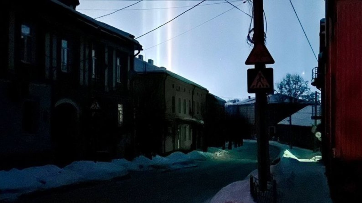 Один стовп жовтіший — це, можливо, вуличне освітлення, натрієва лампа, а праворуч там більш блакитний, це можливо світлодіодні якісь лампи. І це світло йде вгору пучком, потрапляє на крижані пластиночки в атмосфері і вони відбивають світло, і виникає таке явище як “світловий стовп”.