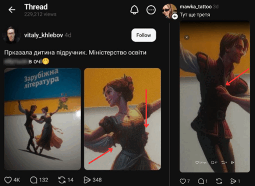 Це помітив українець Віталій Хлебов, акцентуючи увагу на те, що зображення, ймовірно, були сформовані штучним інтелектом. Персонажі там мають зайві руки, долоні, які вигнуті під дивними кутами тощо. Це спочатку помітила дитина Хлебова і показала батьку, а той вирішив поділитися цим у Threads.