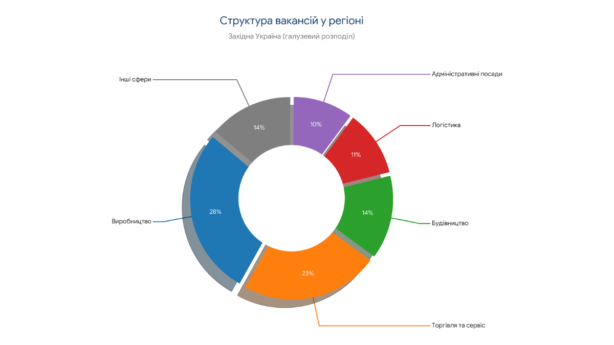 - частка виробничих вакансій у регіонах Західної України становить близько 28 %;