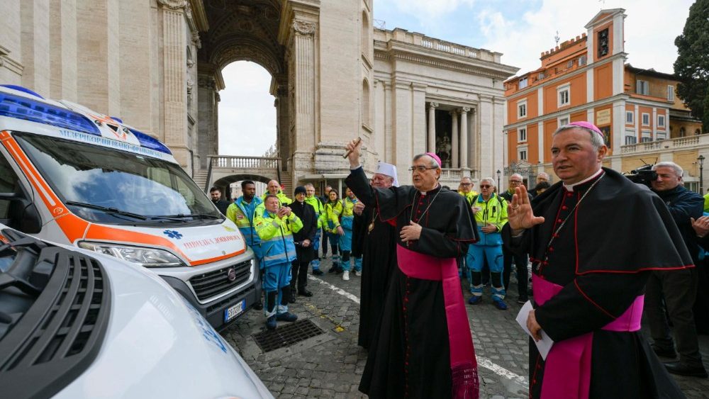 Після аудієнції відбулося освячення двох транспортних засобів – карети швидкої допомоги, яку передають до Івано-Франківська та мобільної амбулаторії, яку передадуть до Вифлеєму (Свята Земля).