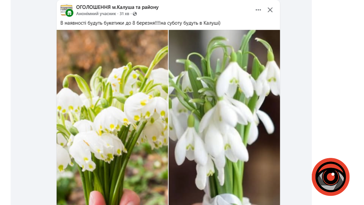 Букетики перших весняних квітів обіцяють на суботу в Калуші. В оголошенні — дві світлини: білоцвіт весняний і підсніжник звичайний. Обидві рослини вважаються рідкісними і за їх зривання і продаж можуть оштрафувати.