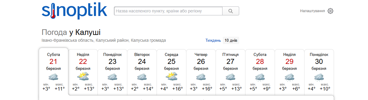 На Калущині, за прогнозами синоптиків, на найближчі 10 днів нічна температура повітря коливатиметься у межах +2…+5ºС, а денна — +13…+15ºС. При цьому саме на останні дні березня прогнозують деяке зниження температури (+6…+10ºС) і дощі.
