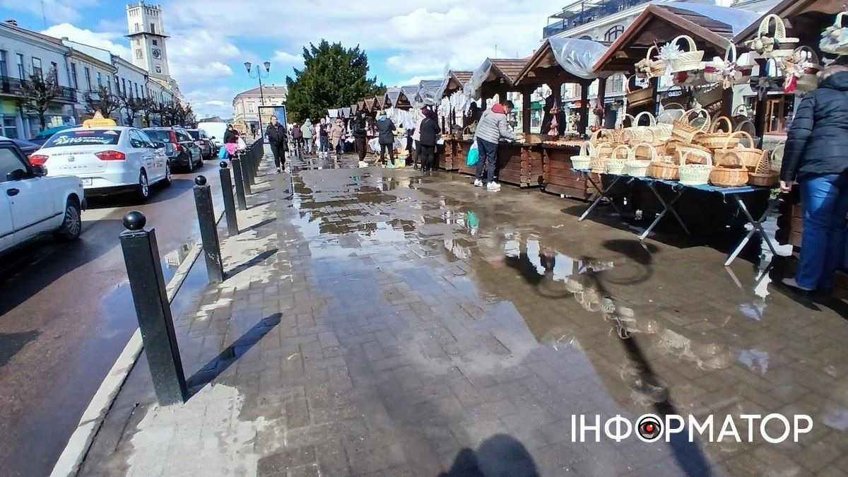 На площі Шевченка відкрився великодній ярмарок, втім покупці змушені були ставати в калюжі води, щоб щось придбати. Причиною цього стала вода з фонтану неподалік, яка через сильний вітер у місті почала затоплювати площу.