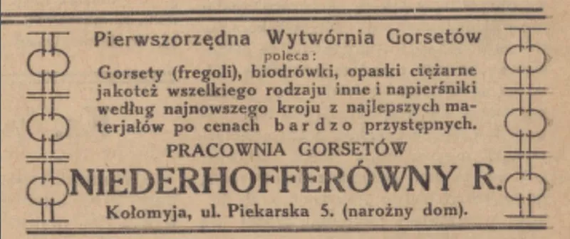 У тій же “Prawda Kołomyjska” за 1932 рік рекламували майстерню корсетів Р. Нідерхоффер: пропонували корсети, бандажі для вагітних та інші вироби за новими фасонами.