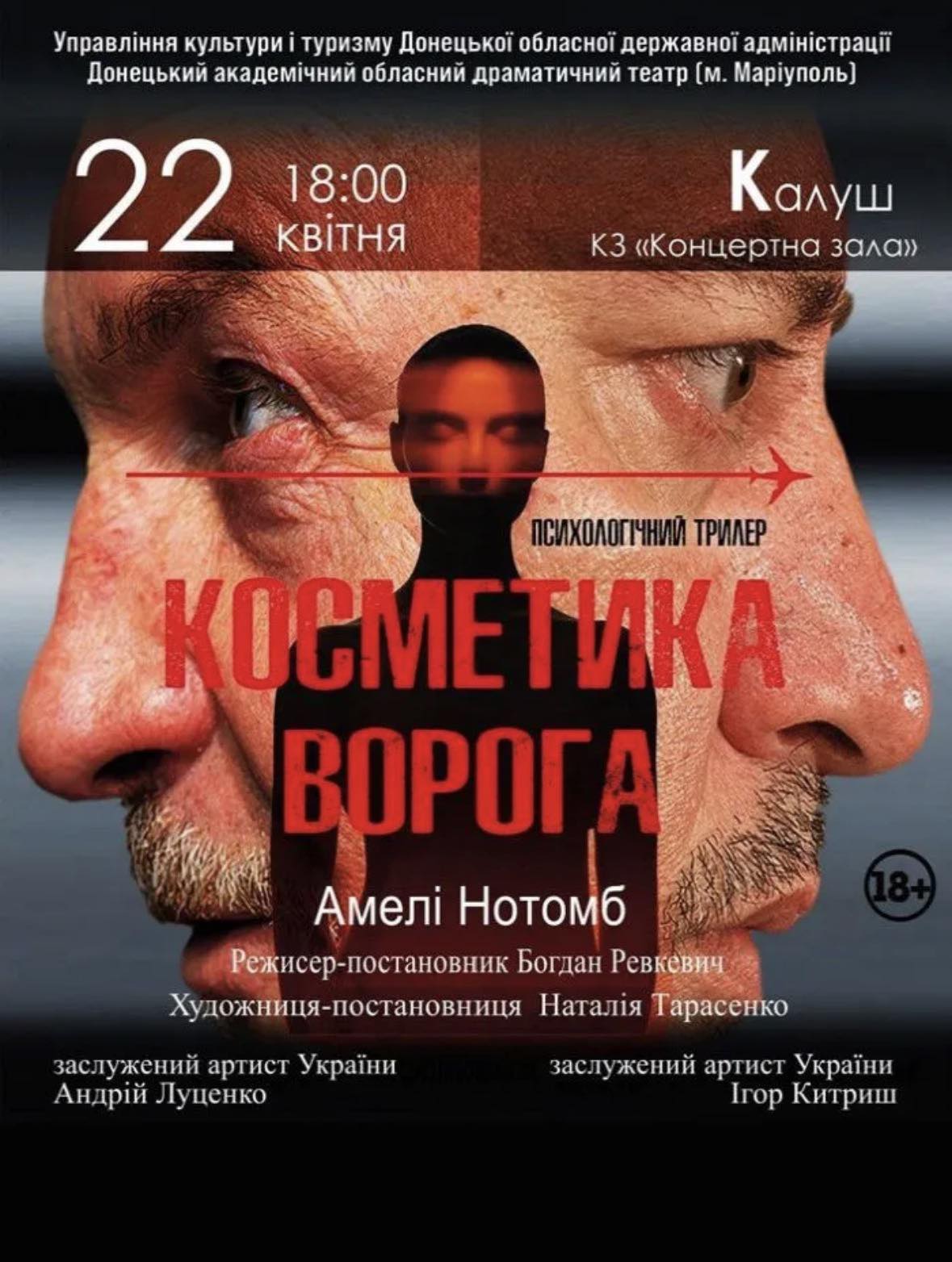 Глядачам буде представлено виставу “Косметика ворога” — психологічний трилер за п’єсою Амелі Нотомб. Постановка вирізняється напруженим сюжетом, що розкриває темні сторони людської психіки, і є однією з ключових робіт театру в період його відновлення в евакуації.