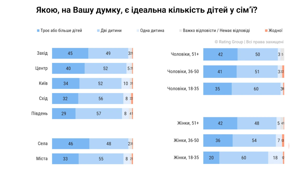 Про те, що варто мати трьох і більше дітей відносно частіше говорять старші респонденти (віком 51+), мешканці заходу України (45%) і центру (40%) країни, а також — у селах (46%).