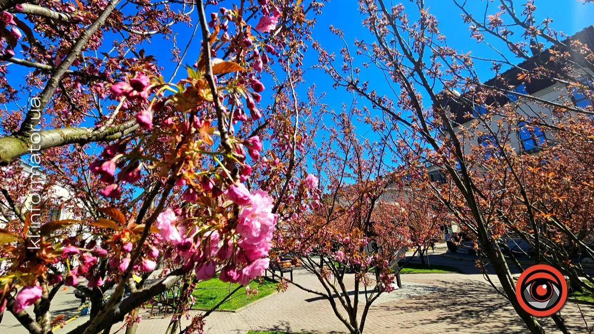 У самісінькому центрі Коломиї вже можна побачити перші повноцінно розквітлі сакури. Дерева створюють атмосферу весняної романтики та традиційно збирають охочих зробити світлини на тлі рожевого цвіту.